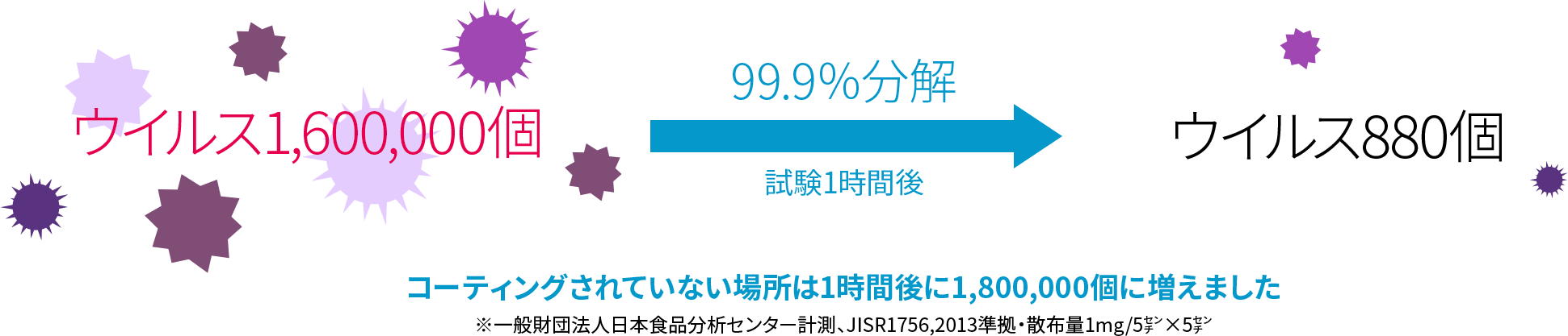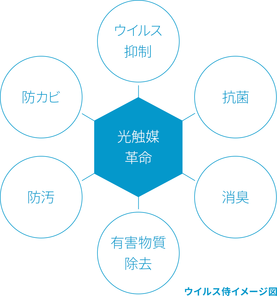 そこに付着した菌・ウイルスなどを無害なもの(水や二酸化炭素など)へ分解する技術です。